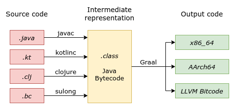 One remarkable thing here is how GraalVM includes both a frontend and backend for LLVM bitcode. The frontend, called Sulong, adds support for executing the bitcode. This, in turn, makes it possible for any program compiled to LLVM bitcode to be executed on GraalVM, allowing easy interoperation with other supported languages.